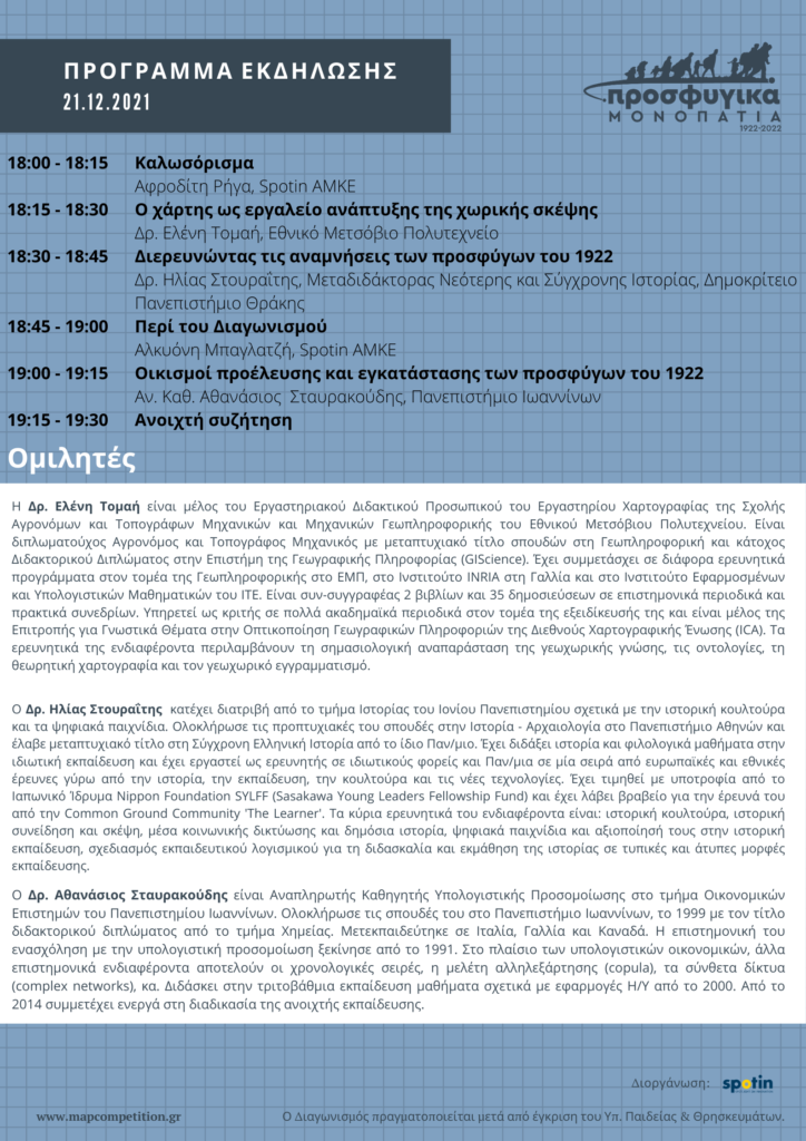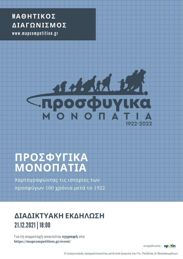 Την Τρίτη, 21.12.2021, πραγματοποιήθηκε η Διαδικτυακή Εκδήλωση Παρουσίασης του 1ου Πανελλήνιου Μαθητικού Διαγωνισμού «Προσφυγικά Μονοπάτια».