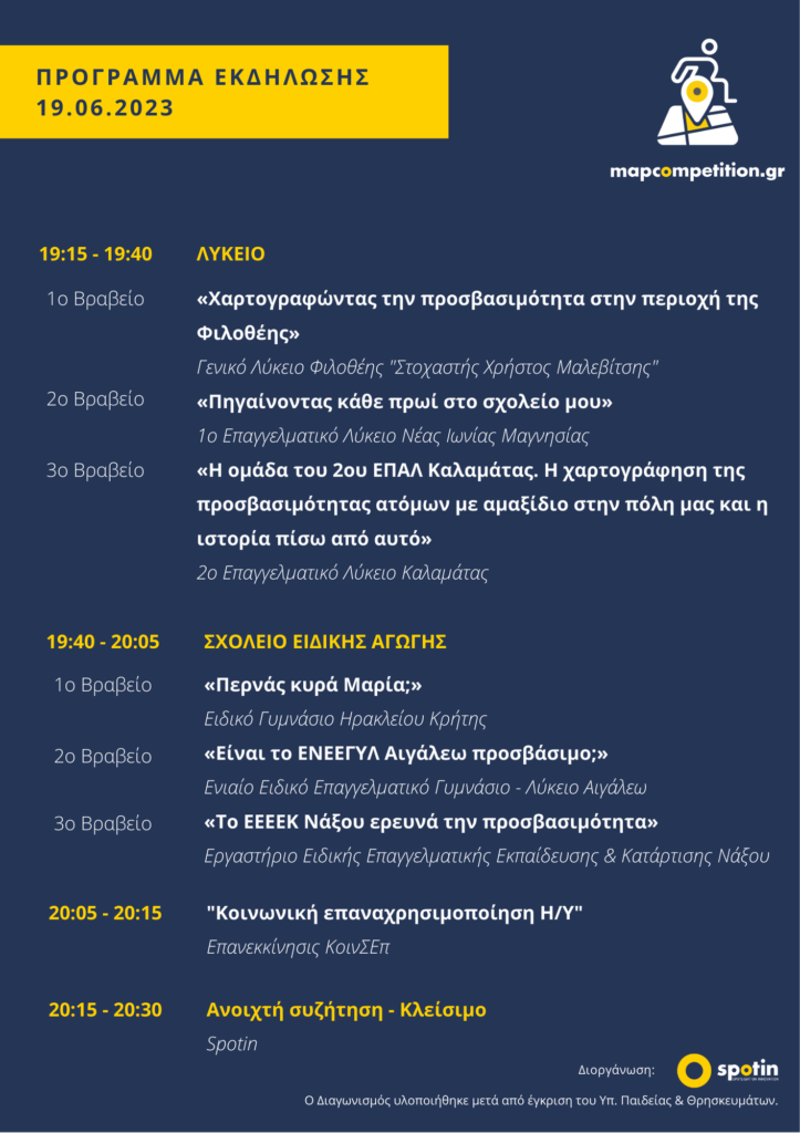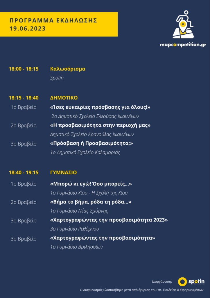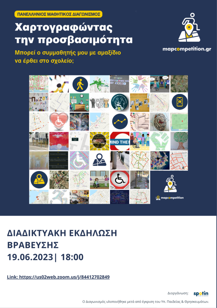 Ο 2ος Πανελλήνιος Μαθητικός Διαγωνισμός Map Competition με θέμα “Χαρτογραφώντας την Προσβασιμότητα: Μπορεί ο Συμμαθητής μου με Αμαξίδιο να Έρθει στο Σχολείο;” ολοκληρώθηκε χθες επίσημα με την καταληκτική εκδήλωση βράβευσης.