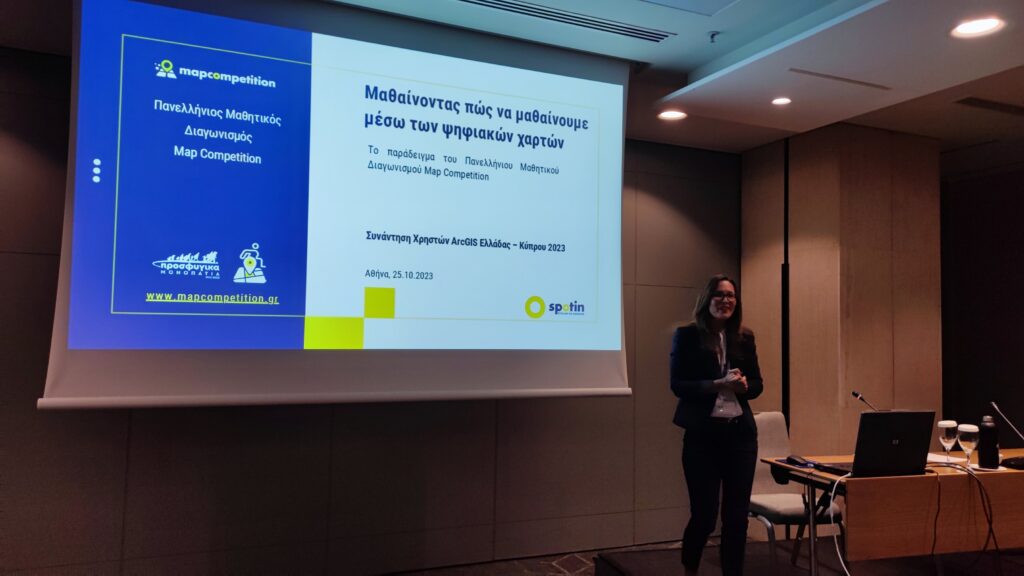 Χρήστες των προϊόντων ArcGIS από Εταιρείες, Φορείς, Πανεπιστήμια και Δήμους σε Ελλάδα και Κύπρο ενημερώθηκαν για τις τελευταίες τεχνολογικές καινοτομίες και παρουσίασαν έργα που υλοποιούν, μεταξύ αυτών και η Spotin, που παρουσίασε τα αποτελέσματα του Διαγωνισμού Map Competition ως best practice για τη μάθηση μέσω ψηφιακών χαρτών στην εκπαίδευση.