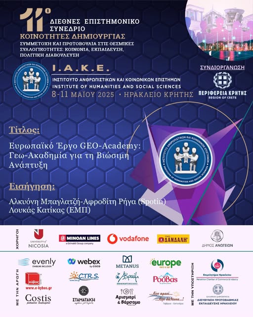Spotin participated in the 11th International Scientific Conference of IAKE (Institute of Humanities and Social Sciences), presenting online the European GEO-Academy project together with the National Technical University of Athens (project leader), represented by Dr. Loukas Katikas.